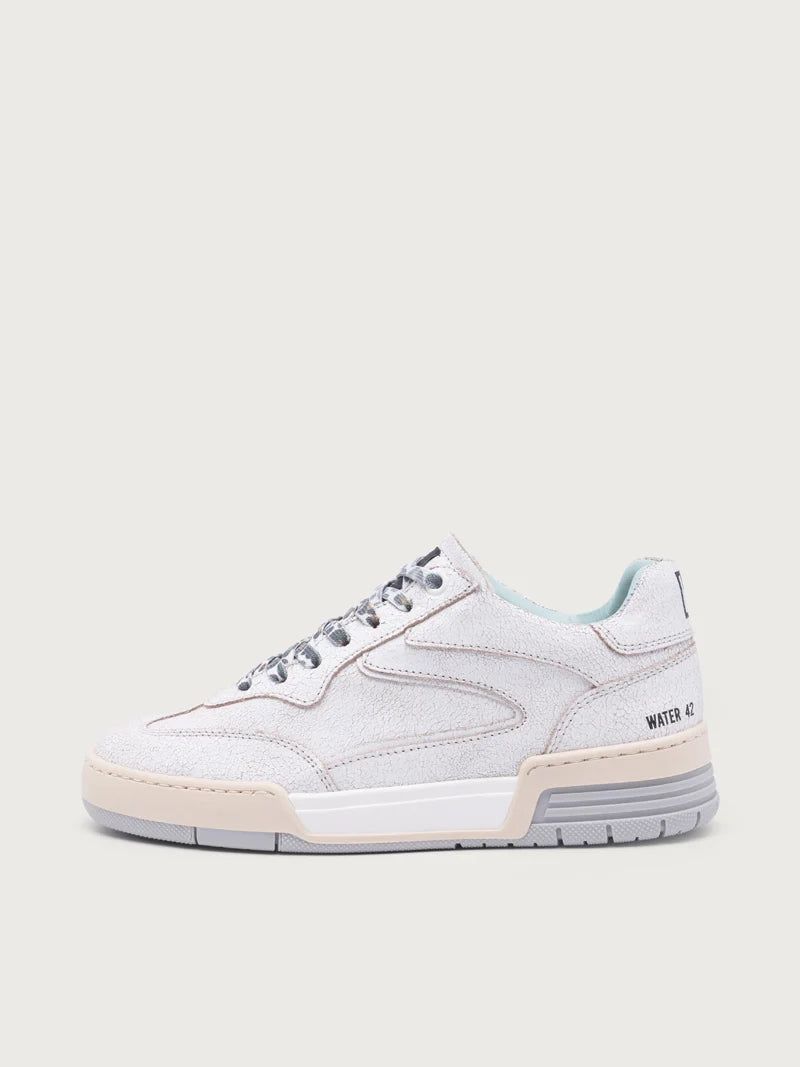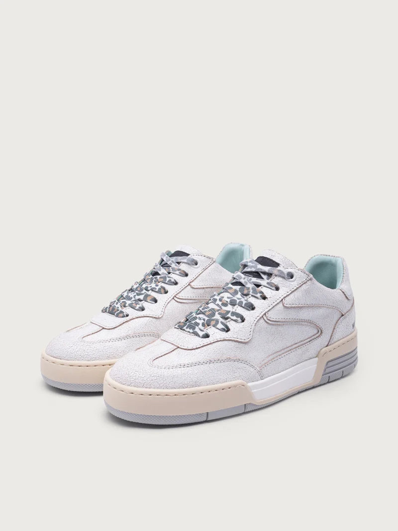 - Upper: Cracked white leather with textured accents