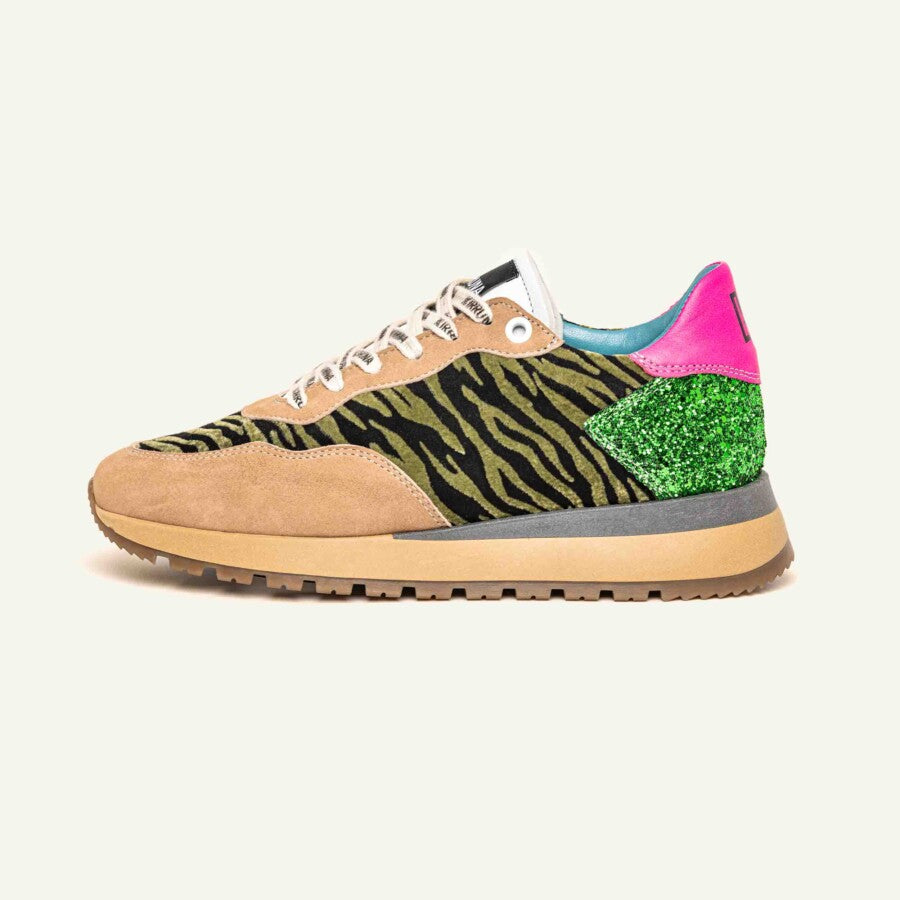 – Features: Runner sole, green zebra suede, suede and leather accents.