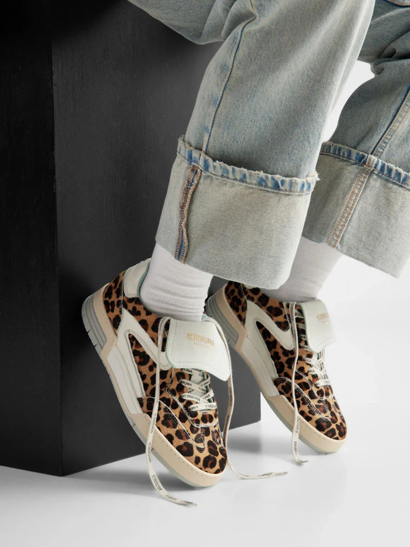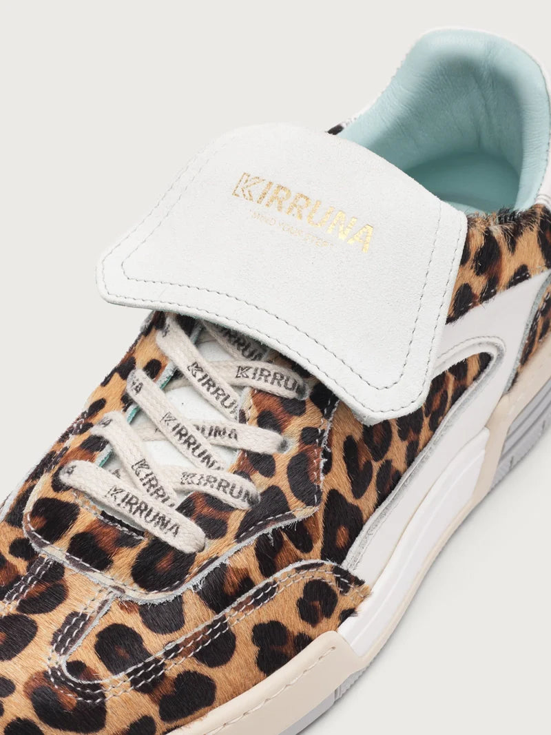 Upper: Leopard-print fabric with white leather accents